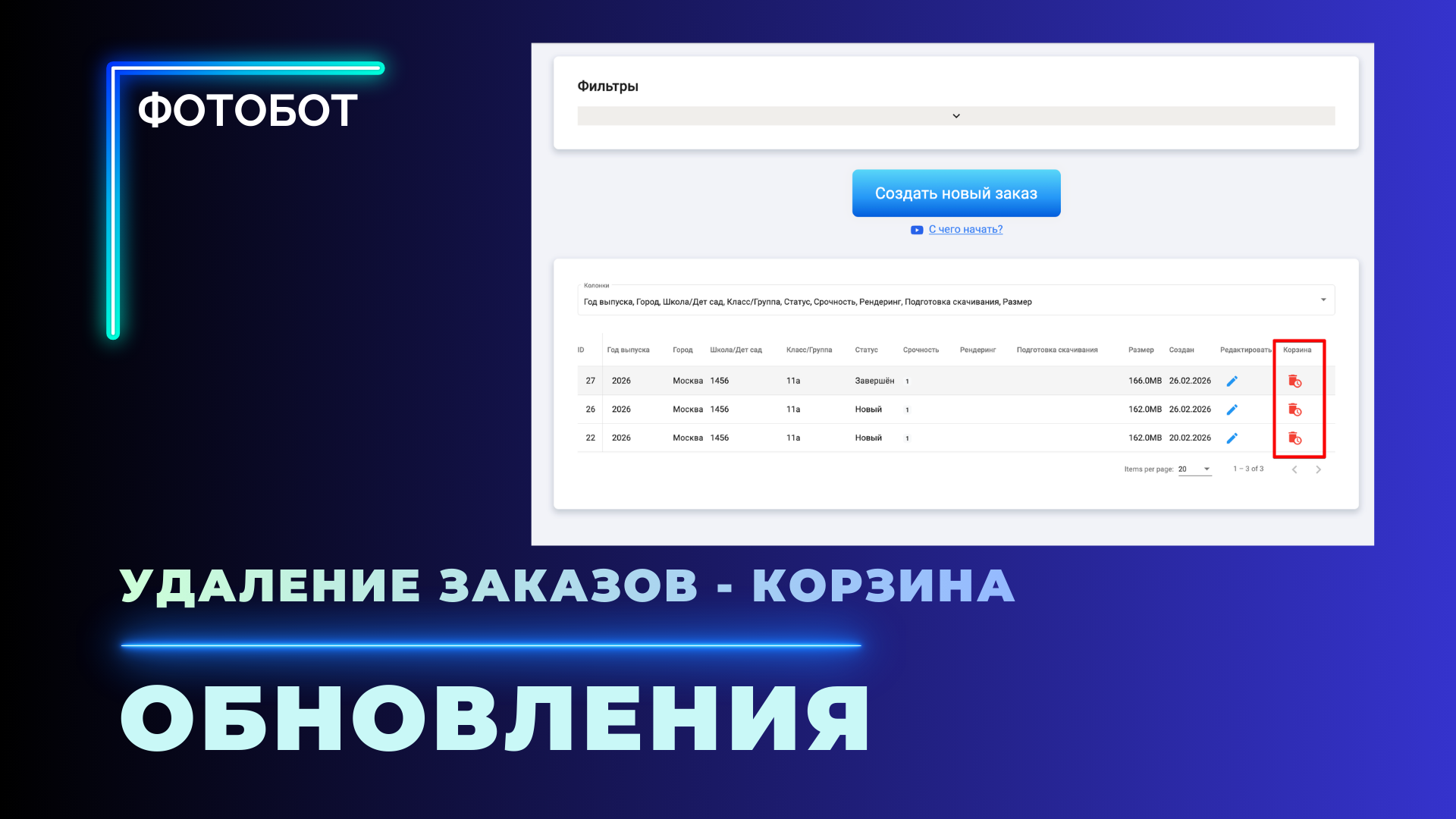 Удаление заказов и корзина восстановления